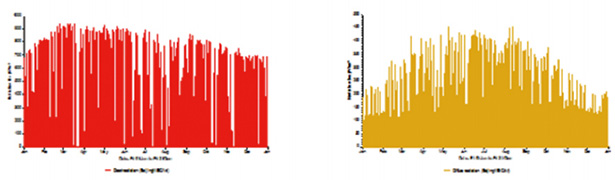 图3 (左)为北京地区全年太阳直射强度变化,图3 (右)为北京地区全年太阳散射强度变化。建筑热能源模型就是根据这些逐时气象数据进行空调冷热负荷计算的。